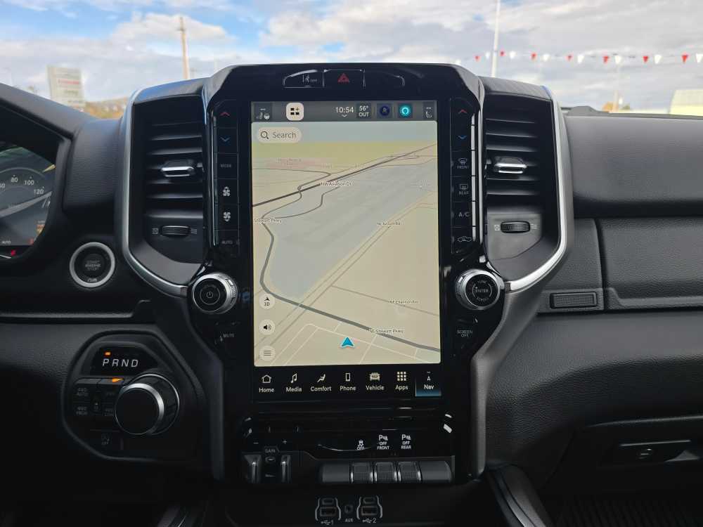 BIG HORN LEVEL 2 EQUIPMENT GROUP SiriusXM Radio Service, Power Adjustable Pedals, Leather Wrapped Steering Wheel, 12 Touchscreen Display, Glove Box Lamp, Auto Power-Folding Mirrors, 115V Auxiliary Rear Power Outlet, Media Hub w/2 Charge Only USBs, Heated Front Seats, Security Alarm, Black Premium Power Mirrors, Premium Overhead Console, 9 Amplified Speakers w/Subwoofer, Disassociated Touchscreen Display, Secondary Active Grille Shutters, Wireless Charging Pad, Body Color Fender Flares, Remote Tailgate Release, 115V Auxiliary Power Outlet, LED Dome Lamp w/On/Off Switch, Universal Garage Door Opener, 2nd Row In Floor Storage Bins, Sun Visors w/Illuminated Vanity Mirrors, LED Footwell Lighting, Rear Window Defroster, Rear View Auto Dim Mirror, Rear Power Sliding Window, GPS Navigation, NIGHT EDITION Tires: 275/55R20 OWL All Season, Bridgestone Brand Tires, Accent Color Premium Power Mirrors, Exterior Mirrors w/Supplemental Signals, Black Headlamp Bezels, Exterior Mirrors Courtesy Lamps, Grille Black Surround Black Mesh, Auto Power-Folding Mirrors, Wheels: 20 x 9.0 Aluminum Painted Clad, Auto Dim Exterior Driver Mirror, Black Exterior Truck Badging, Anti-Spin Differential Rear Axle, Accent Color Door Handles, Accent Color Tailgate Handle, Black Interior Accents, Dual Exhaust w/Black Tips, Body Color Front Bumper, Body Color Rear Bumper w/Step Pads, Black Tail Lamp Bezels, RAM Grille Badge - Black, Black Painted Exterior Mirrors Caps, BED UTILITY GROUP MOPAR Spray In Bedliner, MOPAR 4 Adjustable Cargo Tie-Down Hooks, Pick-Up Box Lighting, Exterior 115V AC Outlet, MOPAR FRONT & REAR RUBBER FLOOR MATS, TRANSMISSION: 8-SPEED AUTOMATIC (8HP75), ENGINE: 5.7L V8 HEMI MDS VVT ETORQUE Active Noise Control System, Heavy Duty Engine Cooling, Passive Tuned Mass Damper, GVWR: 7,100 lbs, Dual Rear Exhaust w/Bright Tips, G/T Exhaust, 18 Aluminum Spare Wheel, 33 Gallon Fuel Tank. Ram Big Horn with Granite Crystal Metallic Clearcoat exterior and Black interior features a 8 Cylinder Engine with 305 HP at 6400 RPM*.