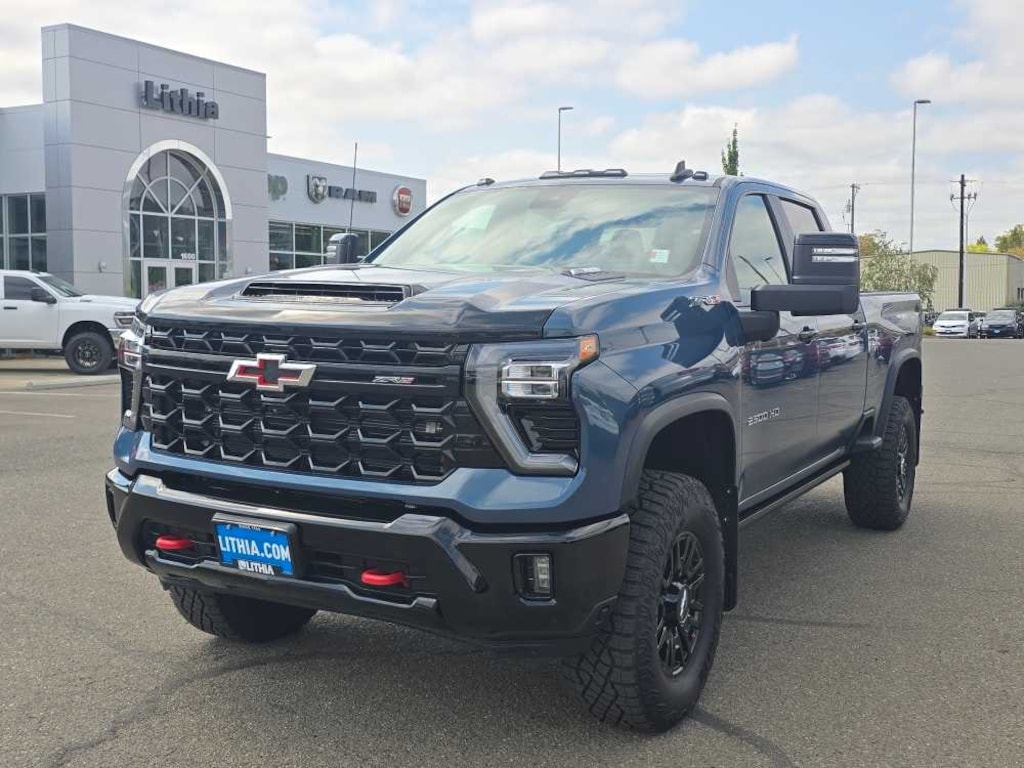 ENGINE, DURAMAX 6.6L TURBO-DIESEL V8 B20-Diesel compatible, (470 hp [350.5 kW] @ 2800 rpm, 975 lb-ft of torque [1322 Nm] @ 1600 rpm), ASSIST STEPS, POWER-RETRACTABLE, BLACK includes LED lighting, TECHNOLOGY PACKAGE includes (DRZ) Rear Camera Mirror and (UV6) Multicolor 15 Diagonal Head-Up Display (Includes (KSG) Adaptive Cruise Control.), SUNROOF, POWER on Crew Cab models, TAILGATE, MULTI-FLEX with six functional load/access features, NOTE: Auto release can be disabled if ball hitch is installed. See Owners manual for details, AUDIO SYSTEM, CHEVROLET INFOTAINMENT 3 PREMIUM SYSTEM with Google built-in compatibility (select service plan required, terms and limitations apply) including navigation capability, 13.4 diagonal HD color touchscreen, includes multi-touch display, AM/FM stereo, Bluetooth® streaming audio for music and most phones; featuring Wireless Apple CarPlay® and Wireless Android Auto® capability for compatible phones, advanced voice recognition, in-vehicle apps, personalized profiles for infotainment and vehicle settings (STD), TRANSMISSION, ALLISON 10-SPEED AUTOMATIC. Chevrolet ZR2 with Lakeshore Blue Metallic exterior and Jet Black/Graystone interior features a 8 Cylinder Engine with 401 HP at 5200 RPM*.