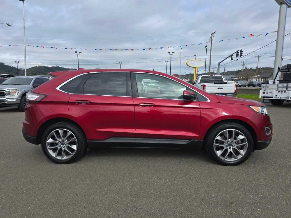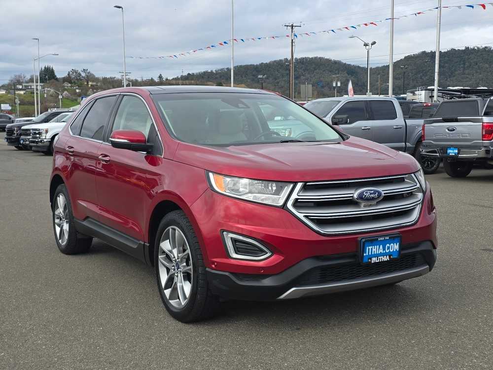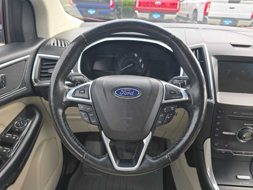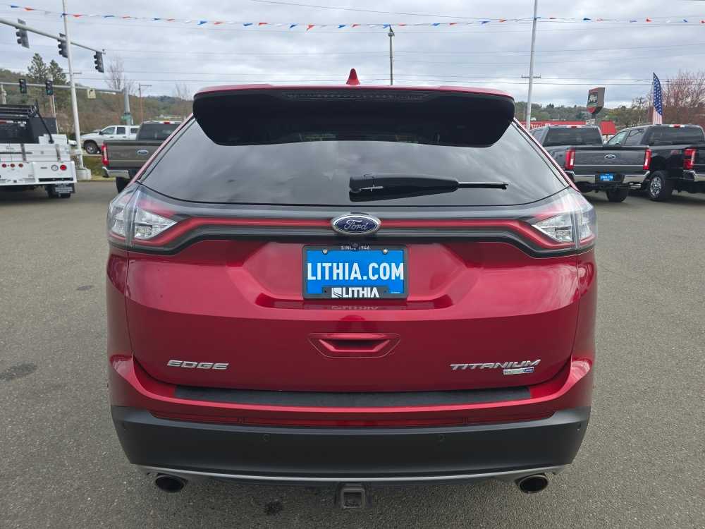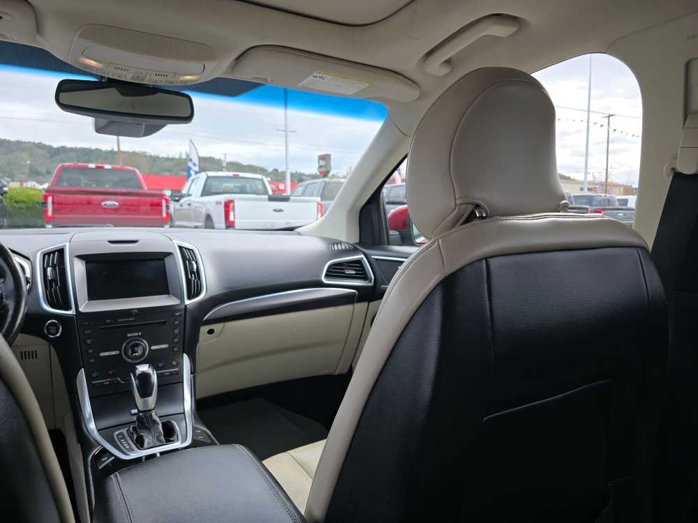 EQUIPMENT GROUP 302A: HID Headlamps w/Auto High Beams, Rain Sensing Windshield Wipers, Heated Steering Wheel, Heated Rear-Seats, Front 180 Degree Camera, split view and camera washer, Lane Keeping Assist, Enhanced Active Park Assist System, parallel parking, park out assist, reverse perpendicular parking and forward and side sensing systems, Panoramic Vista Roof, 2nd Row Outboard Inflatable Safety Belts, Technology Package, Radio: AM/FM Stereo w/Single CD/Navigation, voice-activated touch-screen navigation, Integrated SiriusXM Traffic & Travel Link, SYNC Services are not available in Alaska or Hawaii, Power Converter 110V Outlet, Blind Spot Information System (BLIS), cross traffic alert, Auto-Dimming Drivers Sideview Mirror, Remote Start System. 2015 Ford Edge with Ruby Red Metallic Tinted Clearcoat exterior and Ceramic interior features a 4 Cylinder Engine with 245 HP at 5500 RPM*. Non-Smoker vehicle